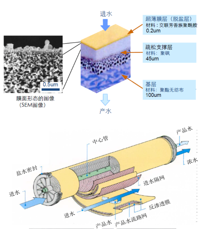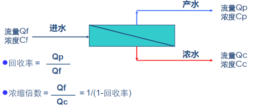 压力迫使一部分进水透过膜,大部分溶解盐则留在膜的进水侧,透过膜的水称为产水;