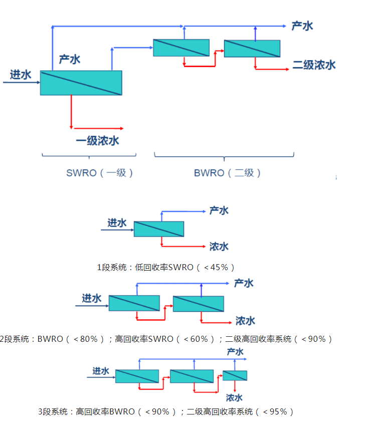 装有膜元件的压力容器的组合俗称排列。段指的是浓水经过了几次压力容器过滤,级指的是产水经过了多少次过滤分离。