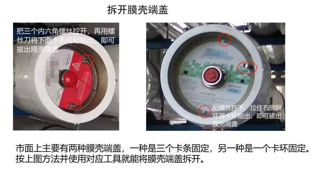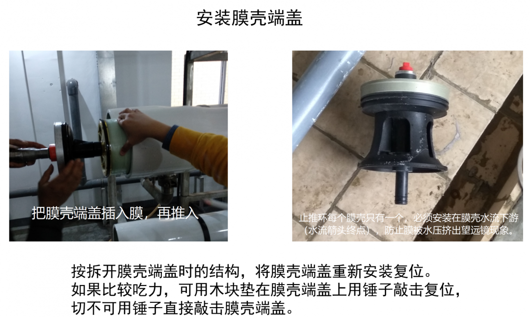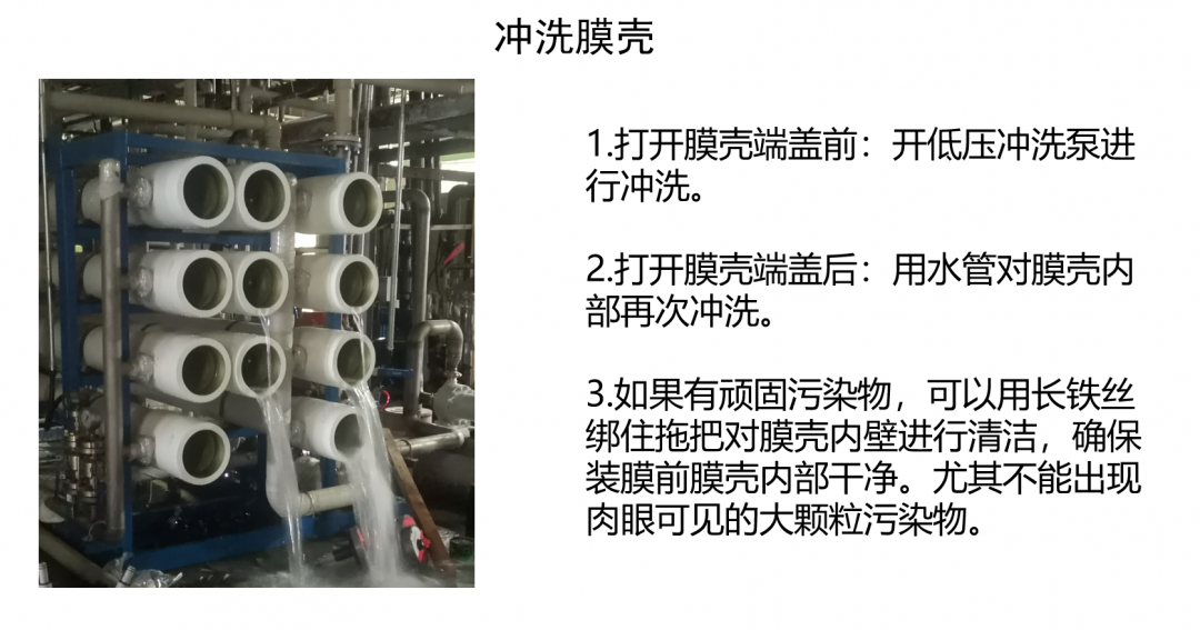 一、旧膜拆下后,需要认真清洗管路,可以用铁丝绑一个拖把来擦净膜壳内壁。防止管路中残留杂质将新膜污染。