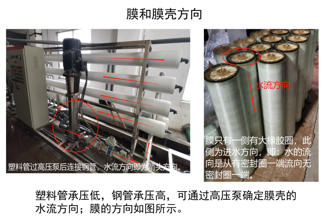 新RO膜安装完成后,应该立即注满干净无氧化剂的水源,用2-4Bar低压冲洗1小时,浓水和产水全部放掉,切勿直接进到二级RO入口或者回到一级RO入口,然后浸泡RO系统12小时以上,待充分润湿后,启动高压泵产水(升压速度 <0.7Bar/秒),但其产水和浓水在头 24 小时内都应该全部放掉,切勿直接进到二级RO入口或者回到一级RO入口。若RO新膜头24小时内的产水直接进到二级RO膜内,可能引起二级RO膜不可逆的通量损失。