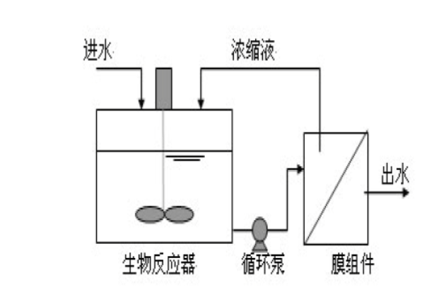 膜组件和生物反应器分开设置,生物反应器中的混合液经循环泵增压后打至膜组件的过滤端,在压力作用下混合液中的液体透过膜,成为系统处理水。