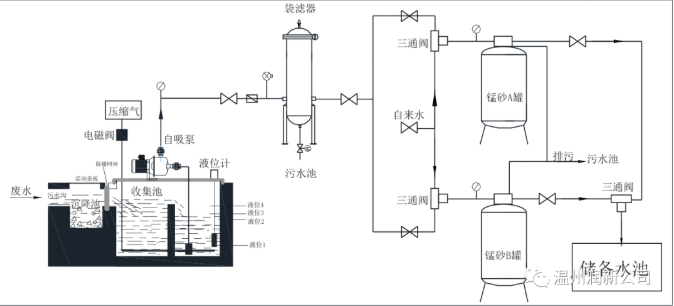 该废水处理系统的工艺流程为:废水→废水沉降池→隔栅网闸→废水收集池(通入压缩空气曝气)→自吸增压泵(根据水池液位启停)→袋式过滤器→电动三通阀(运行、反洗、正洗转换)→锰砂过滤器(一用一备)→电动三通阀(一用一备)→储备水池。