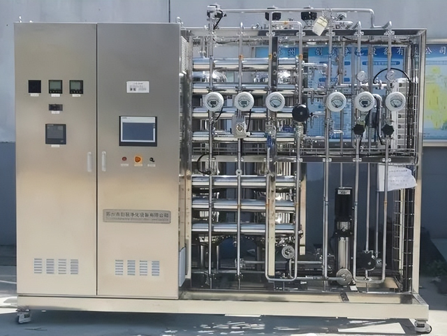 注射用水采用先进的连续电去离子深度净化工艺。部分纯化水送入后段单元,即EDI单元;在EDI单元中离子进一步被脱除,出水在经过精密筒式过滤器后进入带有蒸汽拌热的注射用水储罐,再由注射水外输泵送到板式换热器冷却后进入注射用水管网。